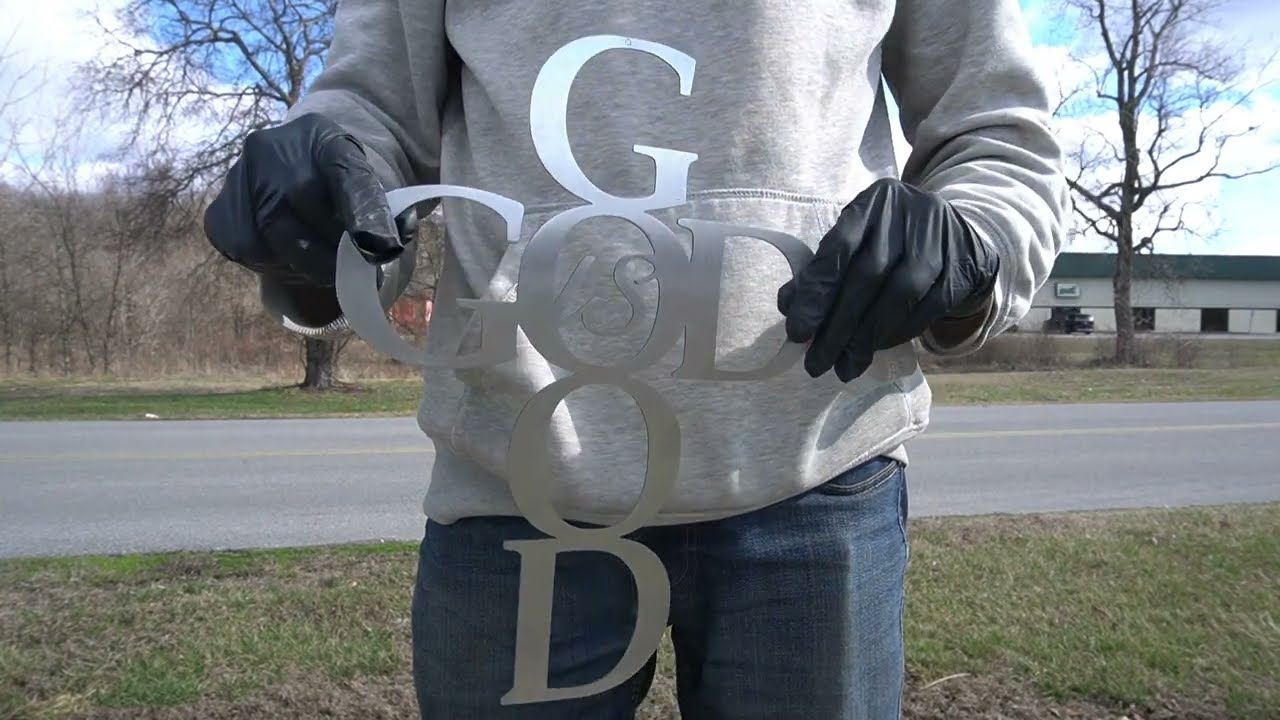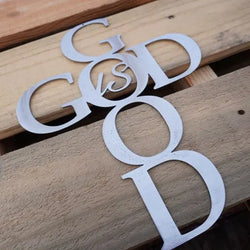 Metal scripture art reading 'God Is Good' made from high-quality steel, perfect for indoors or outdoors.