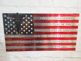 The perfect gift for yourself or any other true American.  Our Pledge Of Allegiance Flag is meticulously handcrafted using the latest in CNC Fiber Laser technology.  The stars are heat treated with oxyacetylene assuring that no two pieces are identical.  The color is achieved with a transparent red powder coat and a glossy layer of clear for ultimate protection.