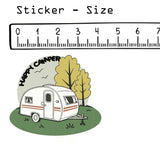 Show off your love for camping and the great outdoors with this adorable 4" wide "Happy Camper" sticker! Featuring a vintage camper surrounded by trees, this sticker is perfect for those who love traveling, RV life, and weekend getaways.