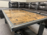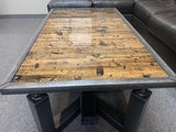 A true industrial inspired piece featuring hand oiled square tubing, reclaimed wood coated in epoxy with bullet shells encased in the top.
